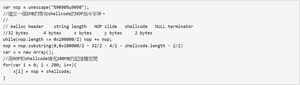 即向heap申請超長的由同一字母组成的Unicode字串),用包含著0x90(NOP指令) 和shellcode(1M內存的尾部)